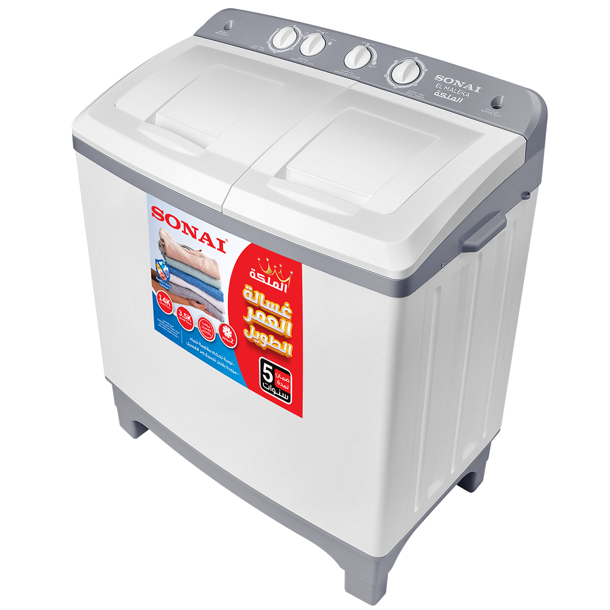 غسالة نصف أوتوماتيك من سوناي بسعة 14 كجم لحوض الغسيل و3.5كجم لسلة التجفيف، مزودة بموتورين للغسيل والتجفيف في نفس الوقت، ومصنعة من خامات مقاومة للبكتيريا لتجربة غسيل صحية وفعالة.